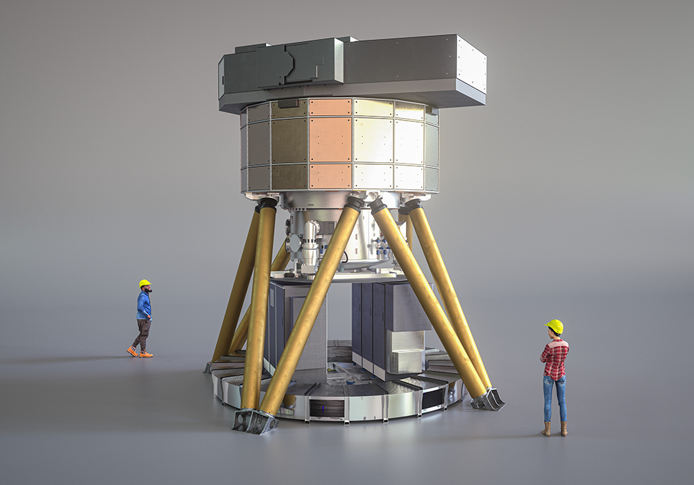 Multi-AO Imaging Camera for Deep Observations, eli MICADO on tulevan ELT-teleskoopin tehokas korkean resoluution kamera. Valmistuttuaan MICADOn avulla tähtitieteilijät pystyvät ottamaan kuvia maailmankaikkeudesta ennennäkemättömän tarkasti. Kuvassa on taiteilijan tekemä 3D-näkymä MICADOsta. Kuvassa on mittakaavan vuoksi kaksi ihmistä. Laitteen korkeus on kuusi metriä ja paino vähintään 20 tonnia. Kuva: ESO/MICADO consortium/L. Calçada