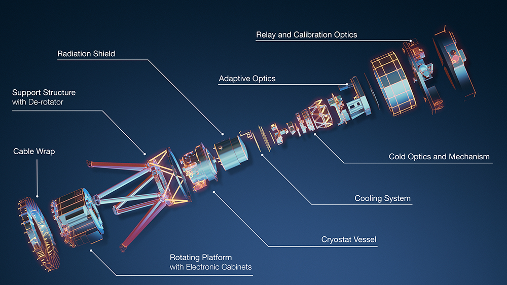 MICADO on ESO:n tulevan ELT-teleskoopin (Extremely Large Telescope) tehokas korkean resoluution kamera. Taiteilijan tekemä 3D-näkymä MICADO-instrumentin osista ja englanninkieliset selitykset instrumentin eri osille. ESO/MICADO consortium/L. Calçada