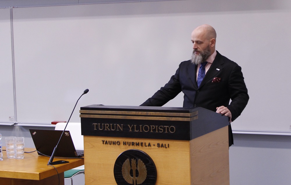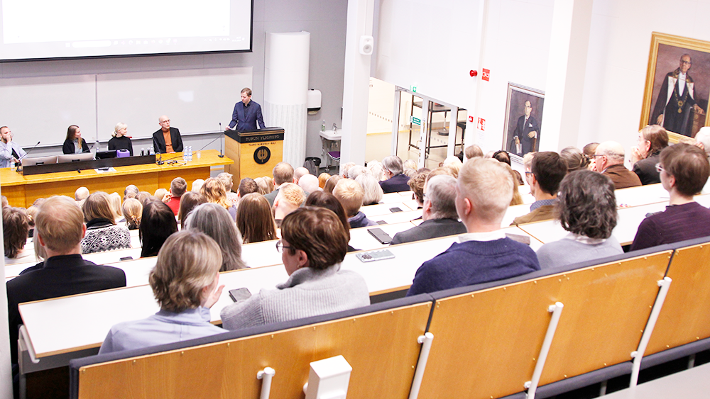 – Tulee muistoja mieleen, kun aika tarkkaan kaksikymmentä vuotta sitten tässä samassa salissa puolustin väitöskirjaani, ja yleisössä oli silloin samoja kasvoja, kuin täällä tänään. Ilo nähdä paljon tuttuja kasvoja juhlimassa yhteistä oppiainettamme, Alho tervehti kuulijoita.