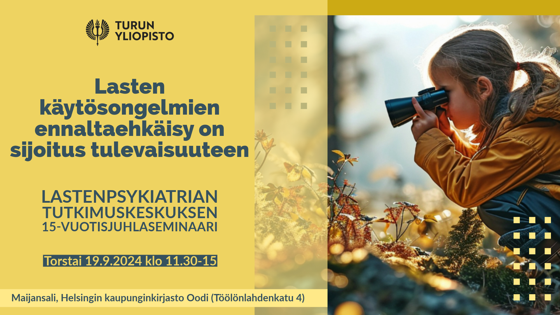 Lastenpsykiatrian tutkimuskeskus aloitti toimintansa syksyllä 2009 ja viettää tänä vuonna 15-vuotisjuhlavuottaan. Juhlavuoden kunniaksi keskus järjestää syksyllä 2024 kaikille avoimen juhlaseminaarien sarjan.