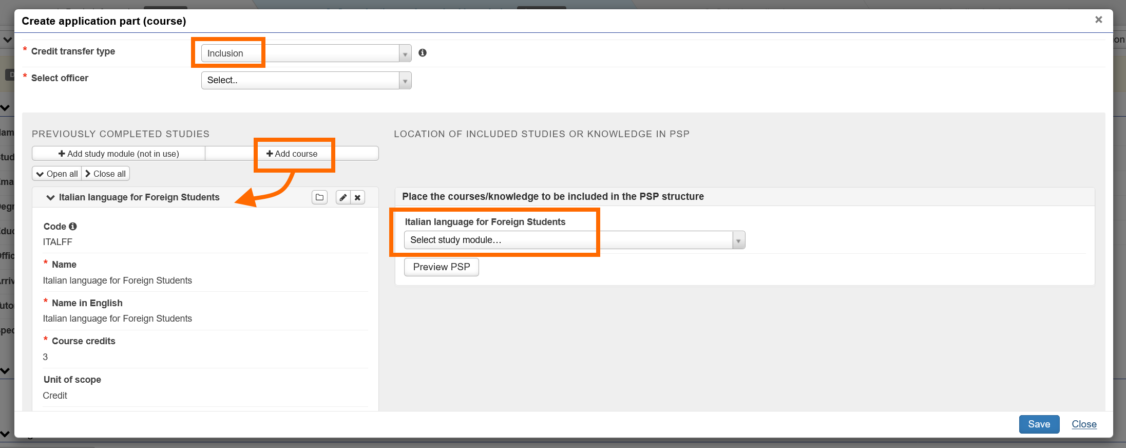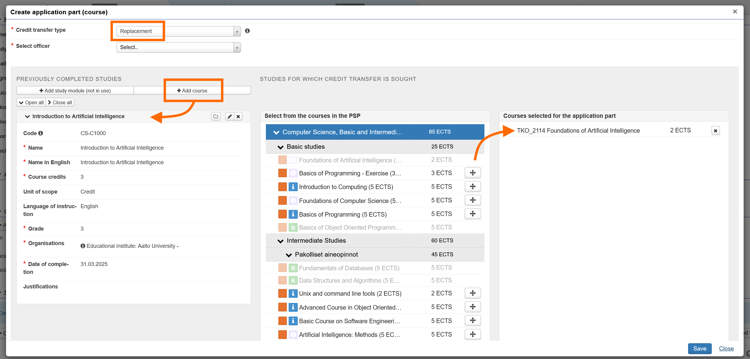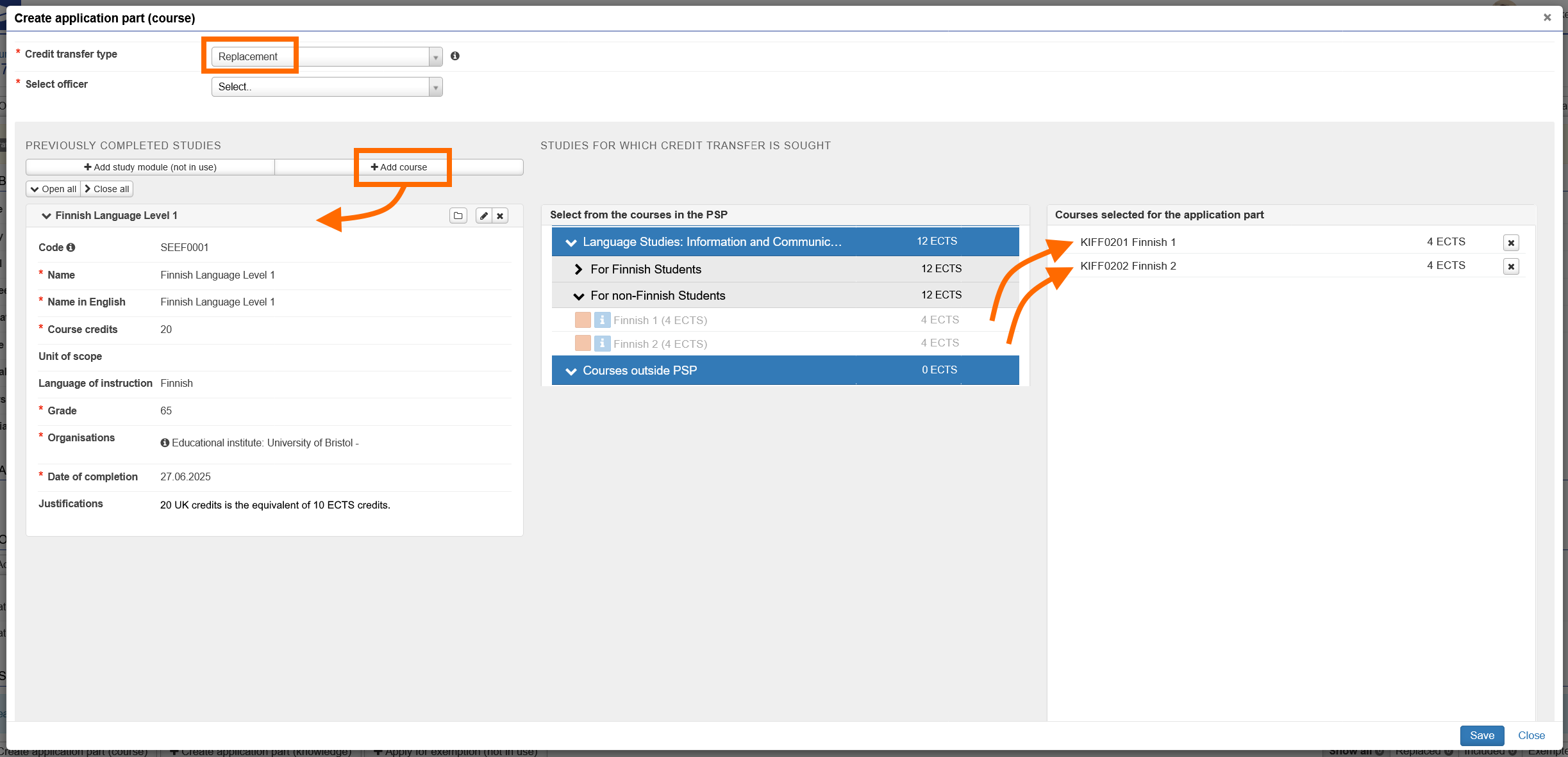 - Do not add any other courses from your PSP that are not relevant to the content of your chosen previously completed course. If you would like replace other courses in your PSP through credit transfer, create a new application part or a whole new application for them.