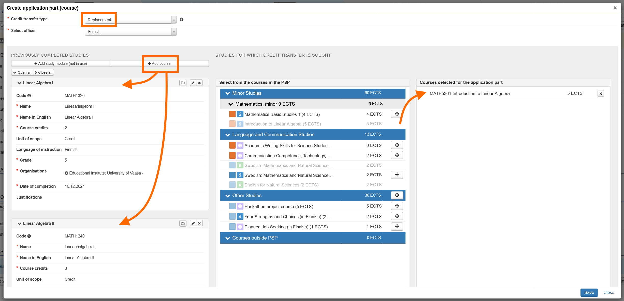 - Do not add here any other courses you have completed previously that are not relevant to replacing the course you selected from your PSP. If you would like to apply for credit transfer for any other previously completed studies, create a new application part or a whole new application for them.