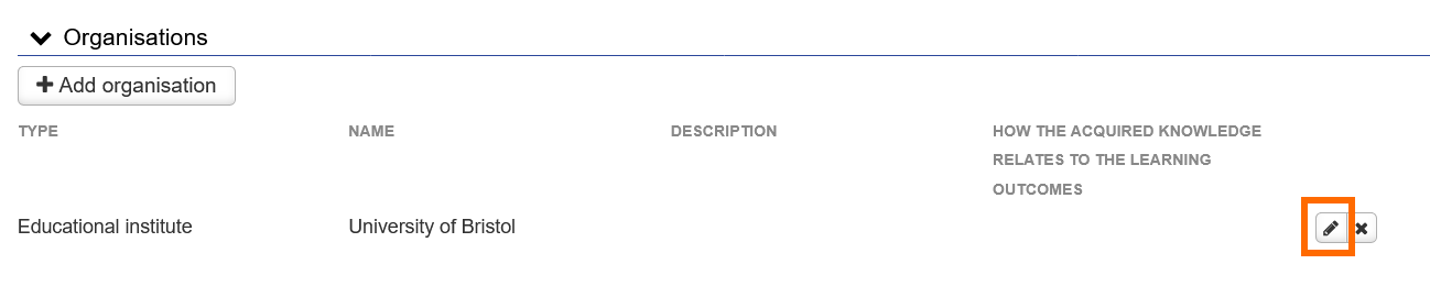 - To edit the details of an organisation or the attachments, click the pen icon next to the organisation name.