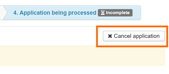 - Cancel the application by clicking the Cancel application button at the top of the page. NB! If your application includes multiple parts and any application part has already been processed (approved or rejected), it is no longer possible to cancel the application. See further below for instructions for such circumstances.