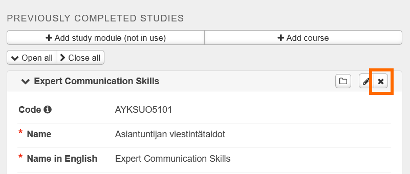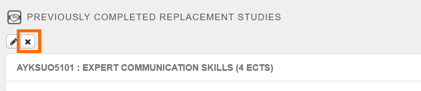 - Remove any application parts from the copy that have already been processed as part of the original application. To remove an application part, go to the Studies or knowledge section and click the X icon for the relevant application part (on the left-hand side of the page).