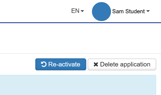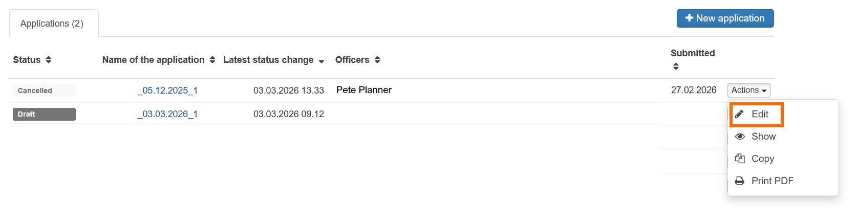 - Click the Actions button for the cancelled application (on the right-hand side of the page) and select Edit.