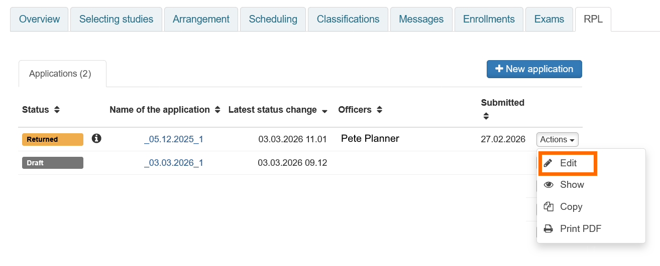 - You will find the application on the RPL tab of your Personal Study Plan in Peppi. The application status will be shown as Returned.