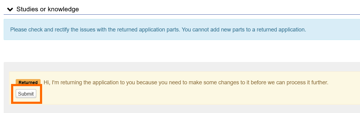 - When you have finished editing the application, go to the Studies or knowledge section and click Submit. The application part in question will be returned to the person assigned to process it.
