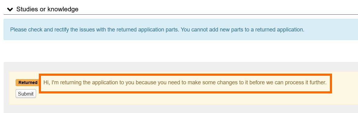 In the Studies or knowledge section of the application, you will see a message from the member of administrative staff or teacher who returned the application to you.