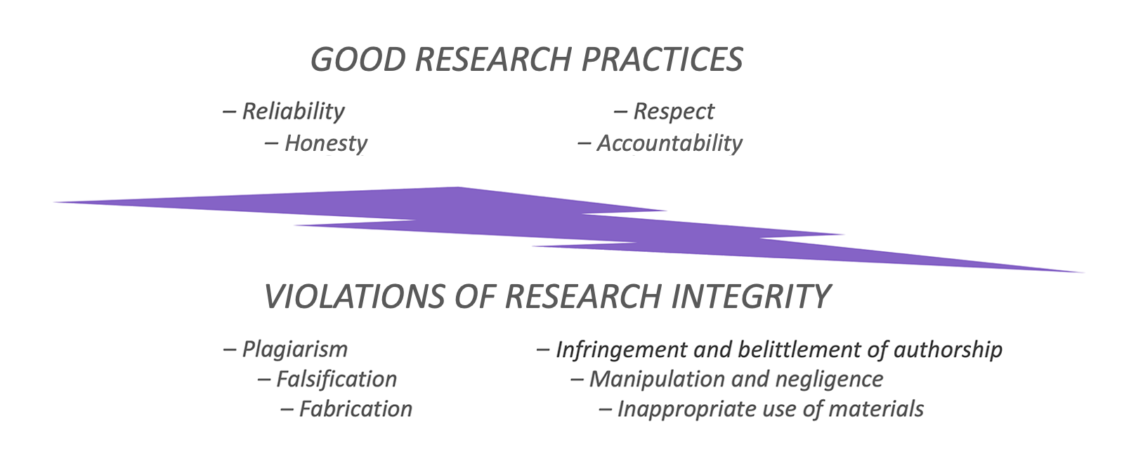 The main types of violations of Responsible Conduct of Research are 1) fraud in scientific activities and 2) disregard for the obligations of good scientific practice.