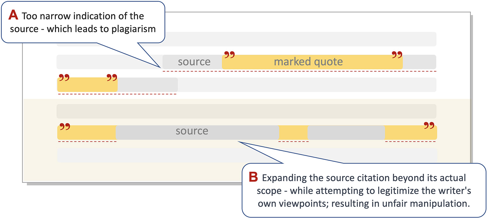 - Masking plagiarism by copying another's text with minor changes. Methods of change may include altering the word and sentence order, replacing words with their synonyms, removing source references, or marking direct quotes as paraphrases by adding accompanying sentences;