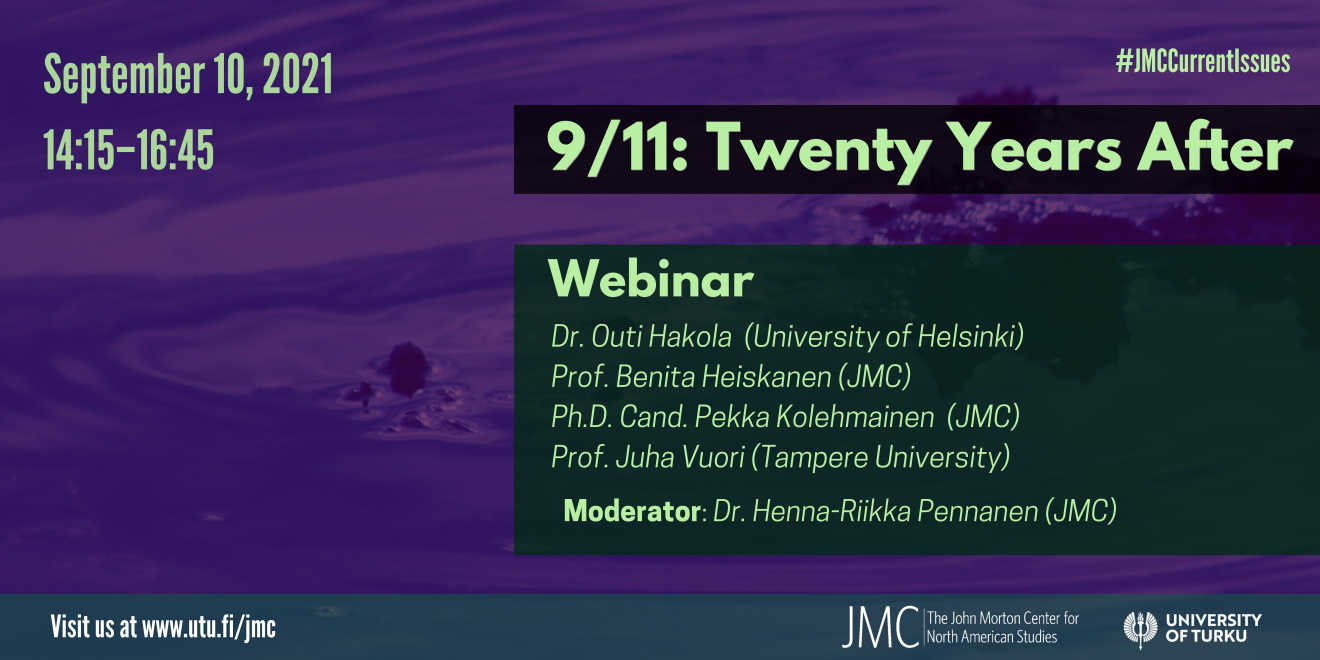 In this webinar, organized by the John Morton Center for North American Studies at the University of Turku, we will consider the ramifications of the 9/11/2001 terrorist attacks on our thinking, worldviews, and ways to conduct research. How have the attacks been interpreted in research, teaching, and media discourses? How have experiences of security and insecurity been delineated in politics and popular culture? What ethical and moral questions have we been confronted with as a result of the strikes? The panelists will offer a phenomenon-based, transdisciplinary discussion that underscores the simultaneity of the historical, societal, and cultural consequences of the attacks and responses to them.