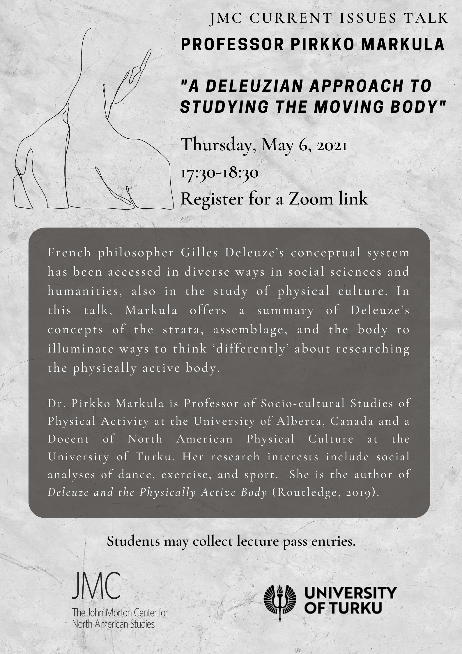With its increased appearance in the social sciences and humanities, French philosopher Gilles Deleuze’s thought is now used also in the study of physical culture. Notoriously difficult to penetrate, Deleuze’s conceptual system has been accessed in diverse ways to analyze the physically active body. In this talk, I aim to offer, based on my recent book, Deleuze and the Physically Active Body (Routledge, 2019), a summary of Deleuze’s concepts of the strata, assemblage, and the body to illuminate ways to think ‘differently’ about researching the physically active body.