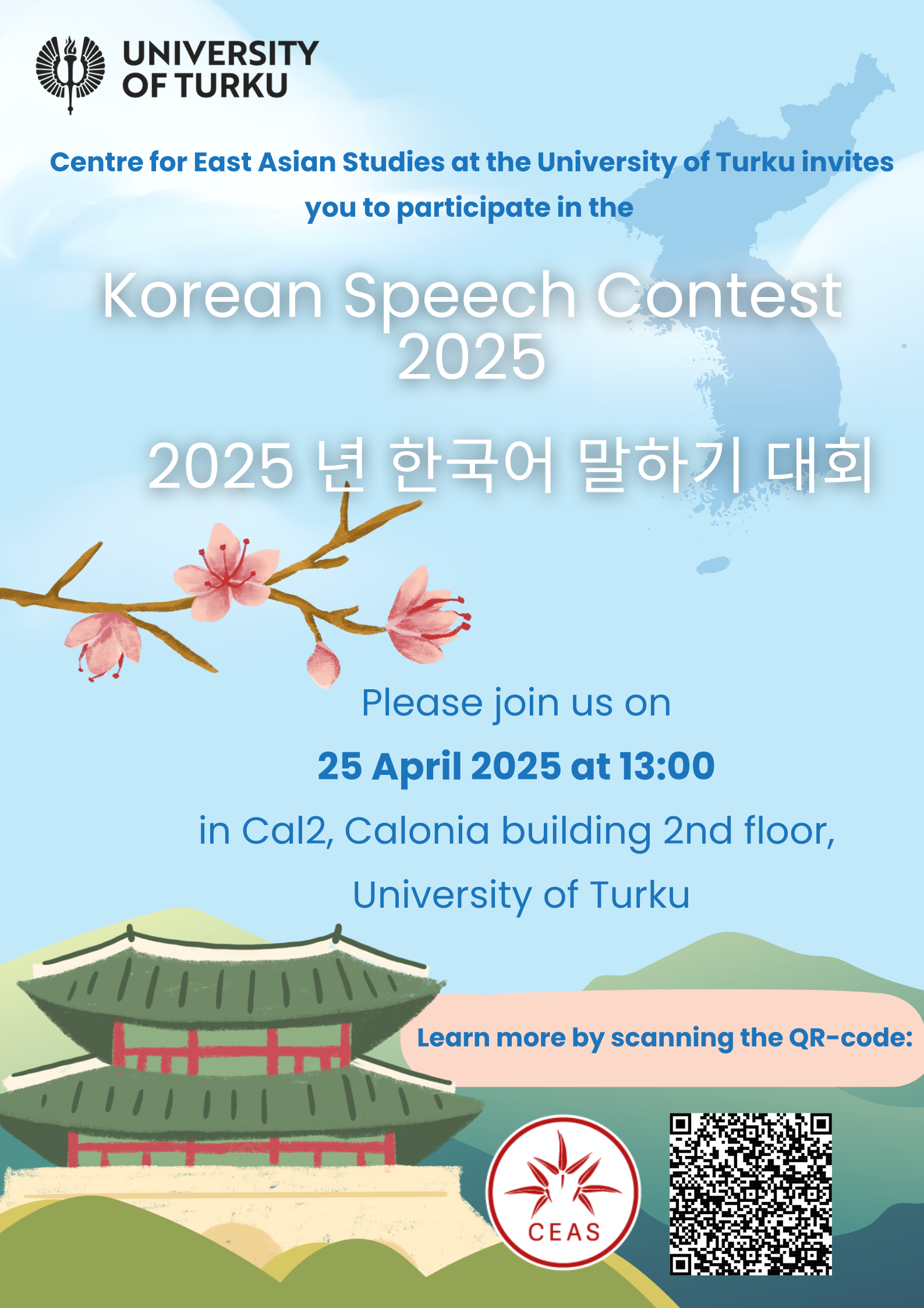 The Centre for East Asian Studies at the University of Turku invites all students of the Korean language to participate in the 2025 Korean Speech Contest in Turku on Friday, 25 April 2025. There will be Korean snacks and drinks for all participants and the audience after the contest, so welcome everyone! All participants receive a prize!