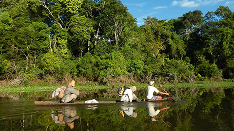 Canoes can reach small rivers and lakes that are unavailable for ships. In the photo above, researchers are going to a field work site using a canoe borrowed from the locals.