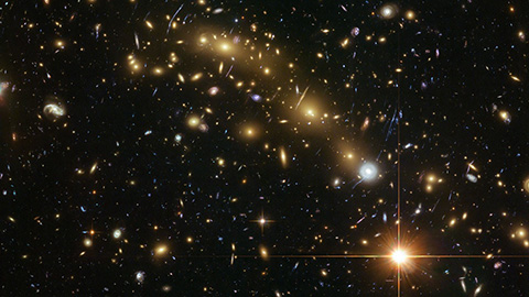 MACS J0416.1-240 is a cluster of galaxies located four billion light years away. A new study based on observations with the Hubble Space Telescope has shown that the most massive galaxies in the universe, which are found in clusters like this, have been aligned with the distribution of neighboring galaxies for at least ten billion years.