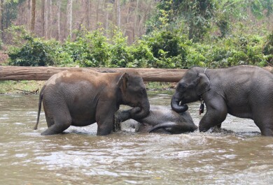 These elephants are semi-captive and their access to social partners is somewhat limited by the working conditions. Their social behaviours do not correspond exactly to the social behaviours of truly wild elephants. However, spending much of their time free in their natural habitat allows the timber elephants to express many of their natural behaviours, which is often not the case in fully captive systems such as zoos.