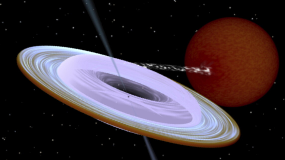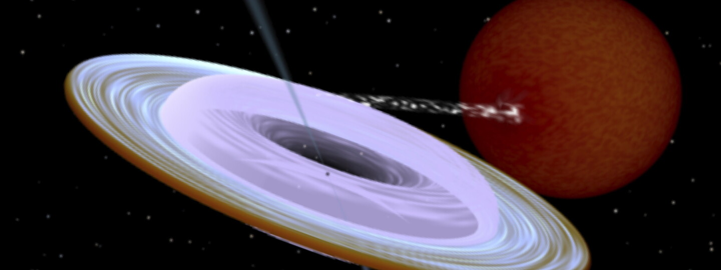 Caption: Artist impression of the X-ray binary system MAXI J1820+070 containing a black hole (small black dot at the center of the gaseous disk) and a companion star. A narrow jet is directed along the black hole spin axis, which is strongly misaligned from the rotation axis of the orbit. Image produced with Binsim (credit: R. Hynes).
