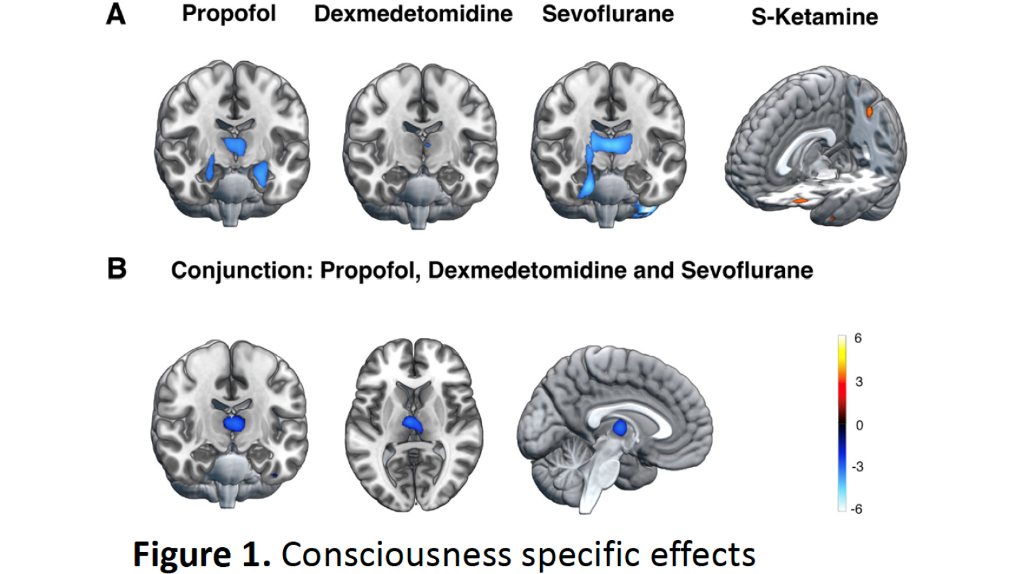 Although reduced activity of the thalamus has already previously been linked to the effects of most anesthetics, it has been unclear whether the reduction is specifically related to a change in the state of consciousness or to other effects of anesthetics. Based on the findings of the present study, the reduced activity of the thalamus seems to play a key role in maintaining the disconnected state during anesthesia when using propofol, dexmedetomidine or sevoflurane.