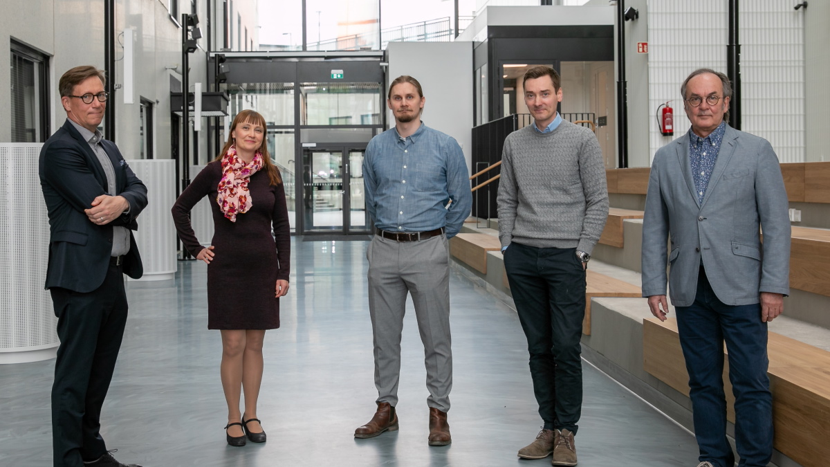 Mikko Pietilä, Chief Medical Officer of the Hospital District of Southwest Finland (left), Saija Tarro, Development Manager of the Turku Brain & Mind Center, and Mikko Hurme, Training Manager, Juho Joutsa, Assistant Professor, and Professor Hasse Karlsson.