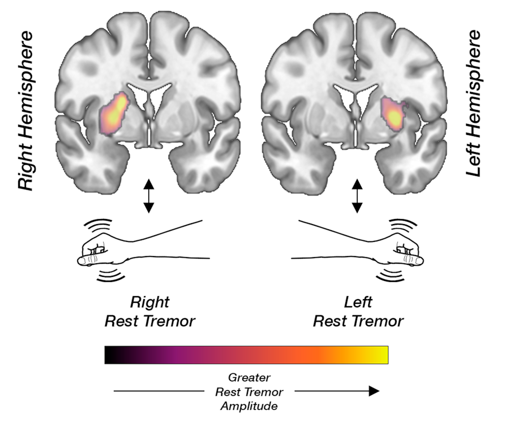 The cardinal motor symptoms of Parkinson’s disease are slowness of movement (bradykinesia), muscle stiffness (rigidity), and rest tremor. Bradykinesia and rigidity are known to reflect degeneration of dopamine-producing neurons. Because most brain pathways cross, this association is typically observed in the striatum on the side opposite to the symptoms. In contrast, the biological basis of rest tremor has long remained uncertain.