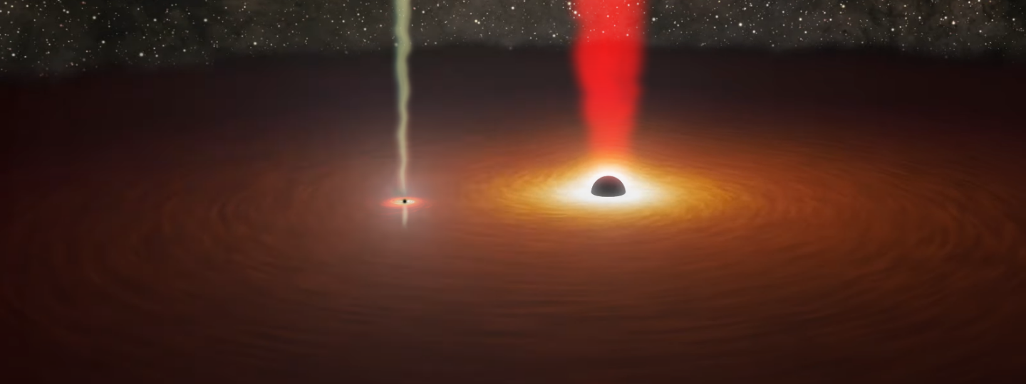 The black holes in orbit around each other. Both black holes have jets associated with them: the larger one with reddish colour, and the smaller one with a yellowish colour jet. Normally only the reddish jet is seen, but during the 12 hour period on November 12, 2021, the smaller jet dominated, and gave a direct signal from the smaller black hole, and was observed for the first time. Credit: NASA/JPL-Caltech/R. Hurt (IPAC) & M. Mugrauer (AIU Jena).