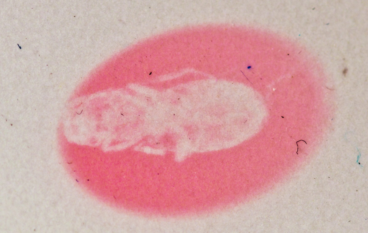After exposure to X-rays, the hackmanite film is left with an X-rayed image of the ant. The photo has been taken with a DSLR camera. Photo: Sami Vuori.