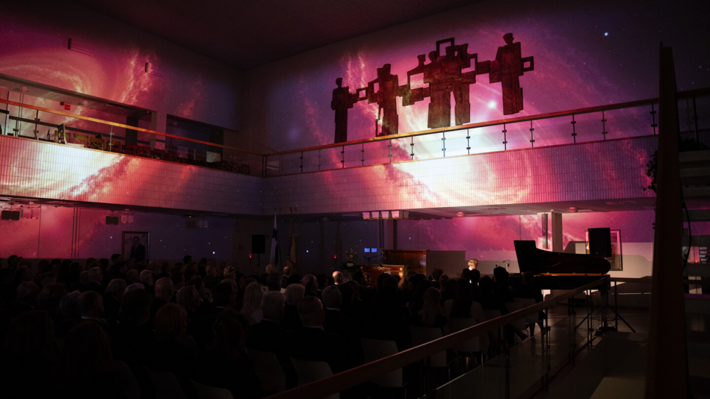 The music for the celebration is provided by pianist Iiro Komulainen. He used artificial intelligence to create music-inspired visuals that wasvprojected onto the walls of the lobby during the performance.