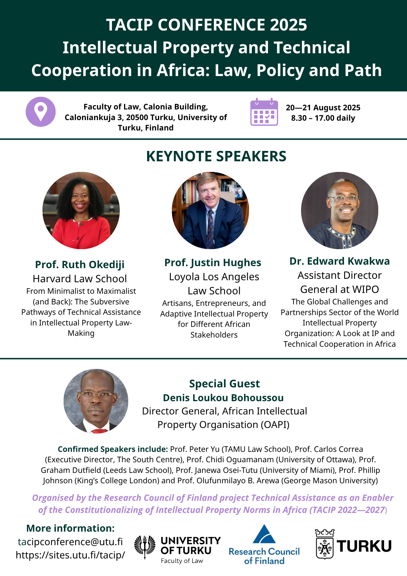 The conference is part of the TACIP research project (Technical Assistance as an Enabler of the Constitutionalizing of Intellectual Property Norms in Africa, 2022–2027) funded by the Research Council of Finland.
