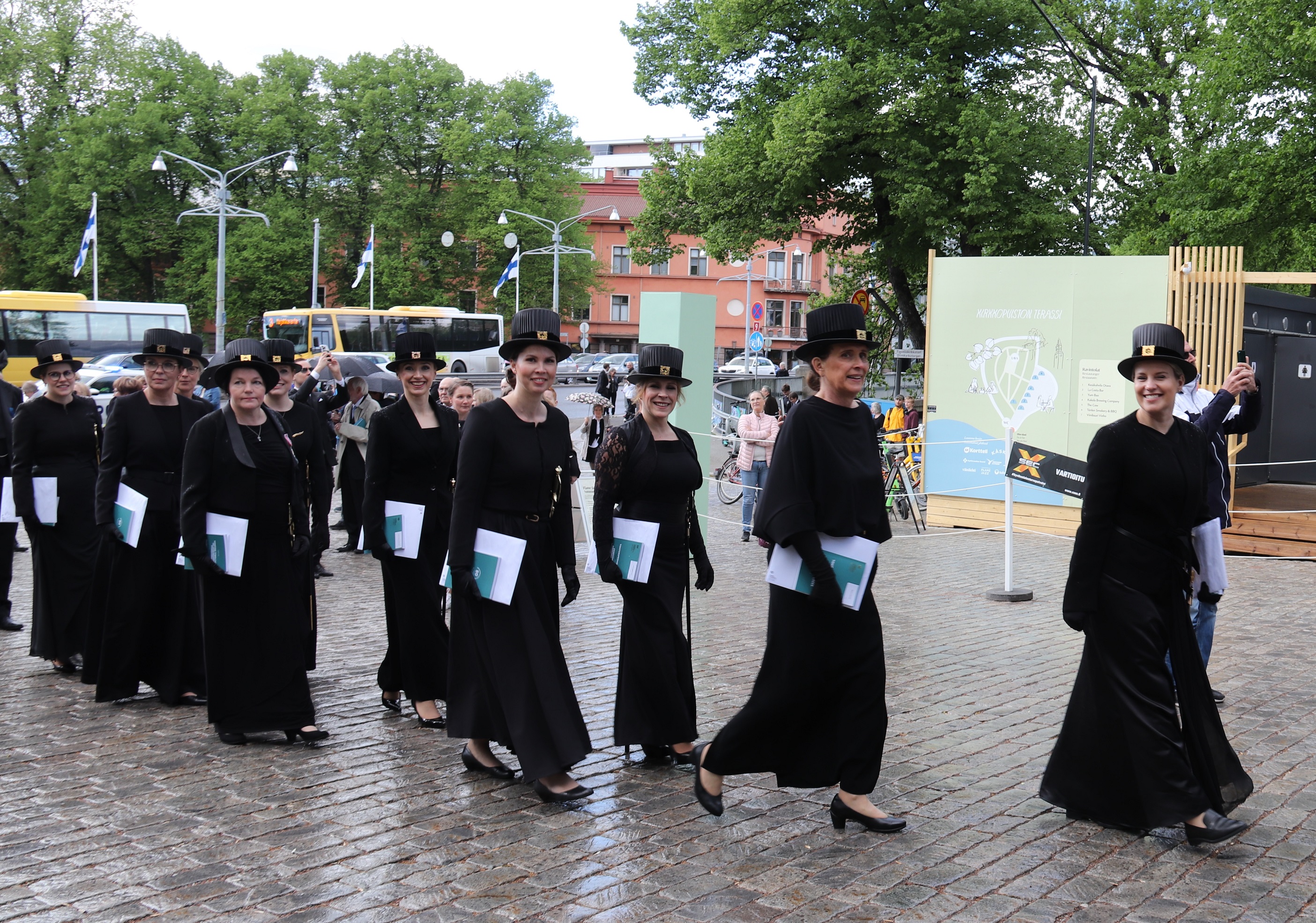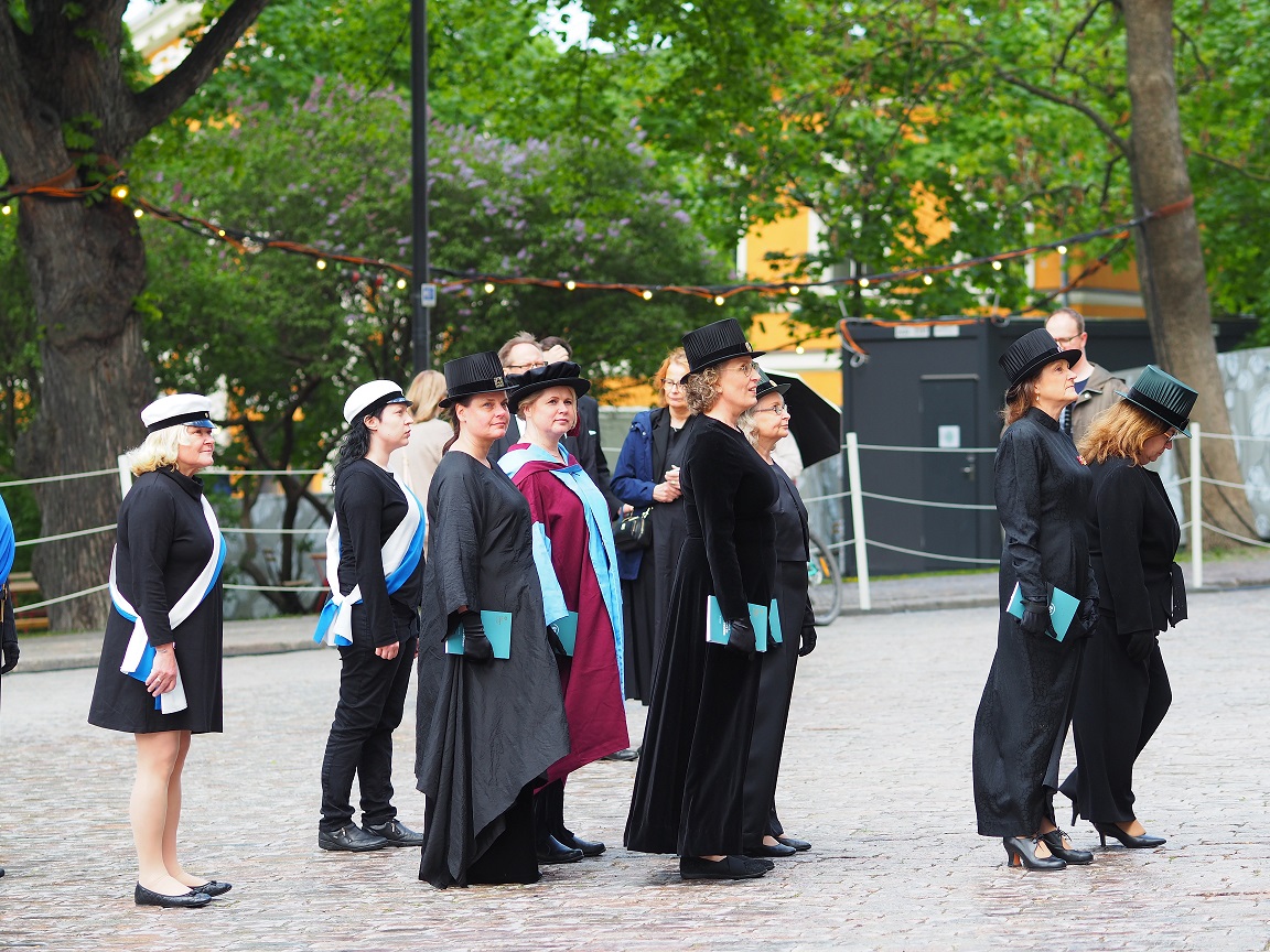 On Friday, 26 May, the doctors were conferred in the Conferment Ceremony and received their hat and sword. All together 152 doctors and 5 Honorary Doctors were conferred in the Ceremonial Conferment. The promoted doctors in Nursing Science were: lina Aitamaa, Mika Alastalo, Heidrun Gattinger, Lotta Hamari, Anne Isotalo, Emilia Kielo-Viljamaa, Terhi Lemetti, Mervi Lepistö, Anni Pakarinen, Heidi Parisod, Laura-Maria Peltonen, Sanna-Mari Pudas-Tähkä, Eriikka Siirala, Camilla Strandell-Laine, Leena Uronen and Jonna Vierula. Adelaida Zabalegui was conferred as the honorary doctor. In the role of the promoter was Professor Maritta Välimäki.