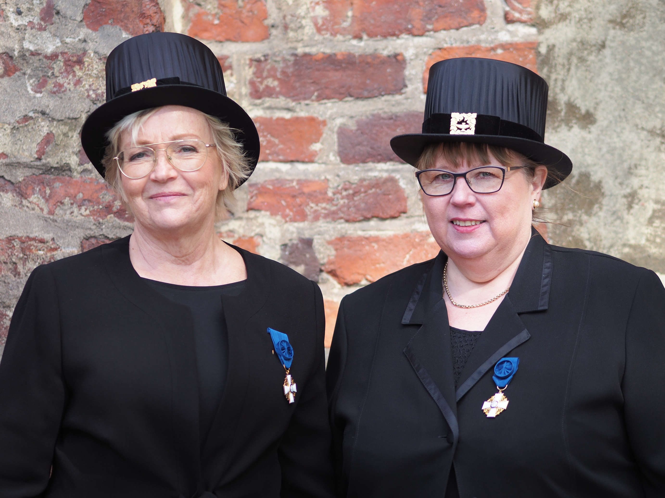 In the photos: Honorary Doctor Adelaida Zabalegui Yárnoz with her husband and Professor Riitta Suhonen, Doctoral candidate Heidi Parsod sharpening her doctoral sword & Doctoral researcher Saija Inkeroinen in the airueen's duties.