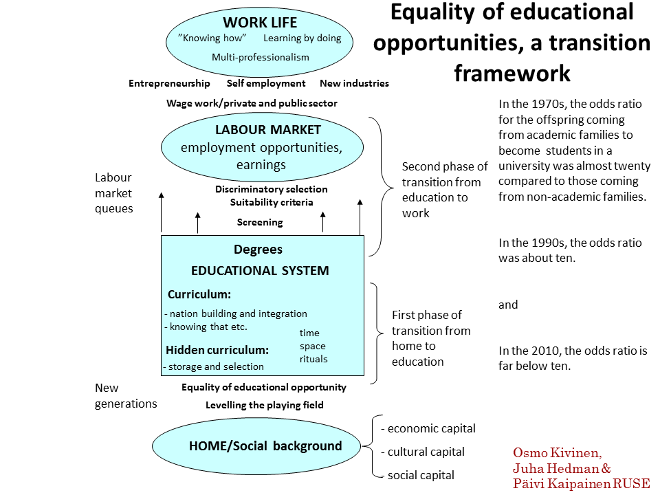 Finnish education policy has for decades aimed at guaranteeing equal opportunities for all regardless of gender, social and regional background. Leaning on statistical data research focuses on the transition of successive generations from home, via education system to the labour market. Equality of educational opportunity will be analysed in terms of chances to participate in university studies from varying backgrounds and between genders. Mechanisms of expansion i.e. increasing educational opportunities, effects of widening access and outcomes in the labour market will be scrutinized. To what extent consequences of educational expansion are intended or unintended will be analysed against policy objectives. Research questions are: to what extent inequality of opportunity has decreased; how the expansion of higher education has affected the status of different educational routes and to what extent equality of educational opportunity is connected with equal outcomes in the labour market.