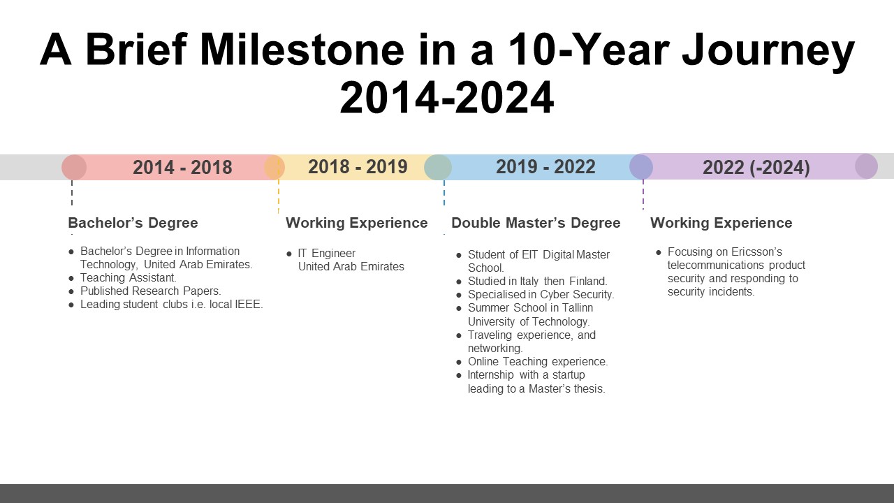 The year 2022 was one of my favourite years, as I became an alumnus of the University of Turku with a Master's Degree in Information and Communication Technology, specializing in Cyber Security. Since then, I have been working as a Security Specialist for Ericsson.