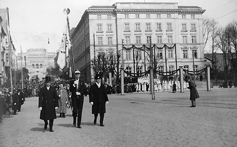 The University's inauguration was celebrated with a ceremonial conferment in May 1927. The Academic Procession proceeds by the Market Square. At the background is the former Phoenix hotel building where the University started its operations.