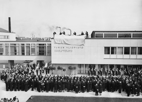 The inauguration of the new University buildings on 23 May 1959. The inscription on the wall of the Main Building, the University's motto “University of Turku - From a free people to free science”, is being revealed.