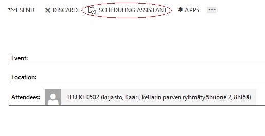 5. After this, choose "Scheduling assistant" to see what rooms are available. Scheduling assistant doen't work for equipment, only rooms.