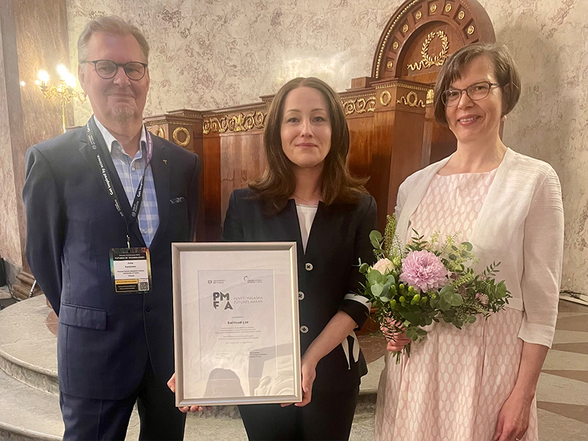 Kuvassa keskellä Soilfood Oy:stä johtaja, digitalisaatio ja markkinointi Mari Jokinen. Vasemmalla Tulevaisuuden tutkimuskeskuksen johtaja Juha Kaskinen ja oikealla tutkimuskoordinaattori Riikka Saarimaa.