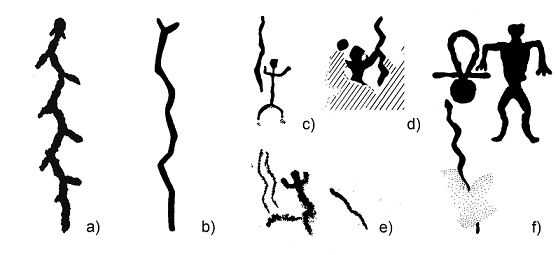 Pohjois-Euroopan kivikautisessa kalliotaiteessa on muiden eläin- ja ihmishahmojen lisäksi myös joskus kuvattu käärmeitä. Muutamassa kalliomaalauksessa ihmishahmo näyttää pitelevän kädessään joko oikeaa käärmettä tai käärmeen muotoista sauvaa.