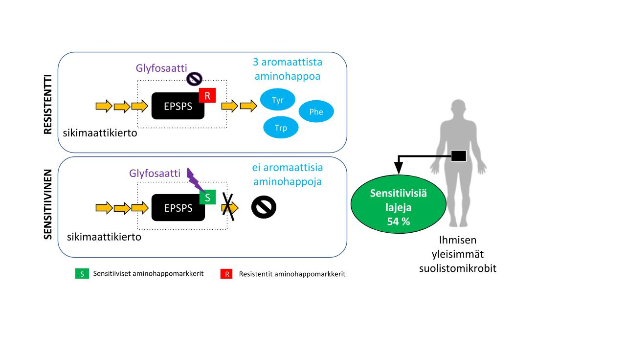 Bakteereilla on sikimaattikierto, jonka EPSPS-entsyymin toiminnan glyfosaatti voi estää. Glyfosaatille sensitiivisten bakteerien sikimaattikierto estyy ja välttämättömiä aminohappoja ei synny. Glyfosaatille resistenttien bakteerien EPSPS-entsyymin toiminta ei häiriinny glyfosaatista. Ihmisen suoliston yleisimmistä bakteerilajeista 54 prosenttia on potentiaalisesti sensitiivisiä glyfosaatille.
