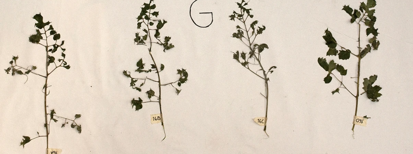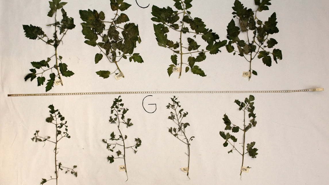 C-rivillä olevat tomaatinlehdet ovat kontrollikasveista, jotka kasvatettiin lähes glyfosaatittomalla lannoitteella. Suuremmille glyfosaattijäämille altistuneiden kasvien persiljamainen lehti ja pienempi biomassa näkyvät selvästi alemmalla G-rivillä.