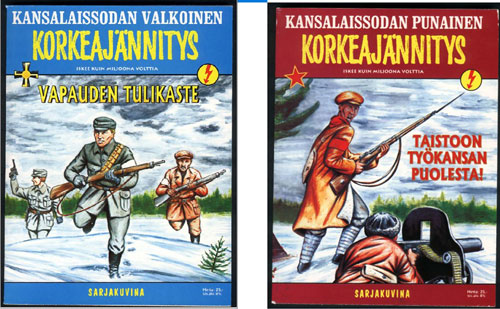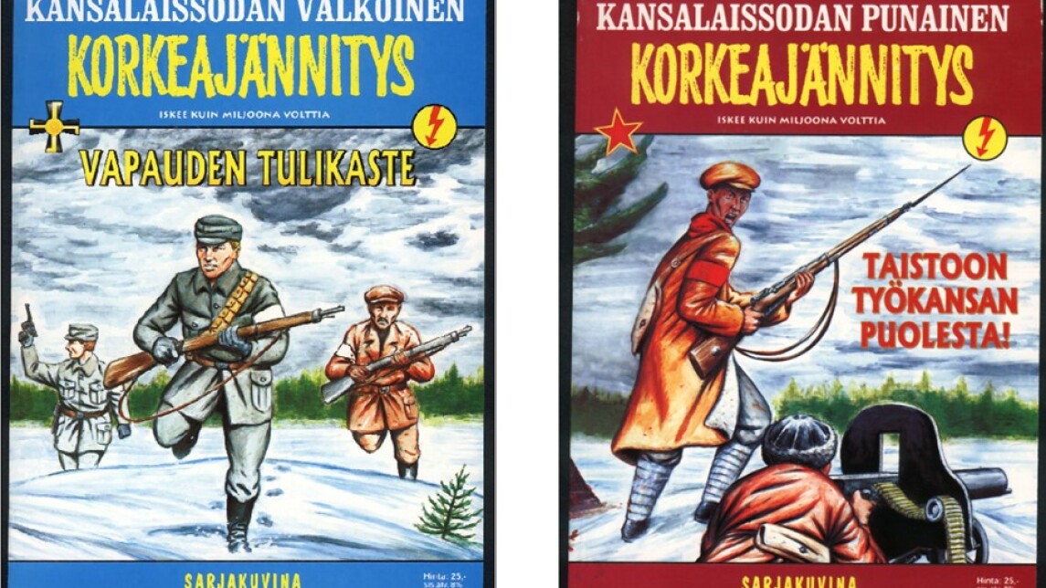 Uusimmassa vaiheessa myös populaarikulttuuri on kuvannut sisällisotaa. Korkeajännitys-lehti teki omat lehtensä sekä punaisten että valkoisten näkökulmasta. Kuvat: Työväenmuseo Werstas.