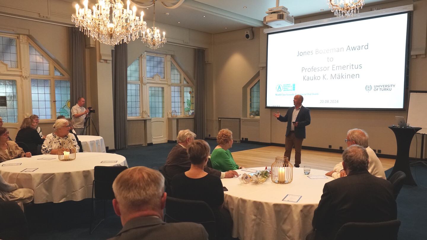 Hammaslääketieteen laitoksen emeritusprofessori Kauko K. Mäkiselle luovutettiin tiistaina 20.8. klo 17 hotelli Hamburger Börsissä järjestetyssä tilaisuudessa yhdysvaltalainen The Jones Bozeman Award -tiedepalkinto hänen elämäntyöstään ksylitolitutkimuksen parissa.