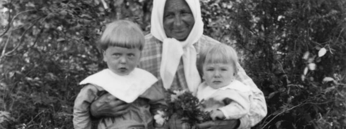 Kuva: Viljamaa, Frans. Aili Lehtorannan Mummo Kahden Lapsenlapsensa Kanssa Tunnistamattomassa Puutarhassa. Lähde Mäntsälän museotoimi / Finna.fi