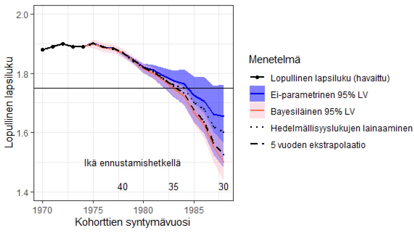 – Laskun voimakkuus riippuu ennustemenetelmästä ja sen taustalla olevista oletuksista. Joka tapauksessa lopullinen lapsiluku naista kohden laskee todennäköisesti lähes kahdesta lapsesta selvästi alle 1,75:n, Hellstrand sanoo.