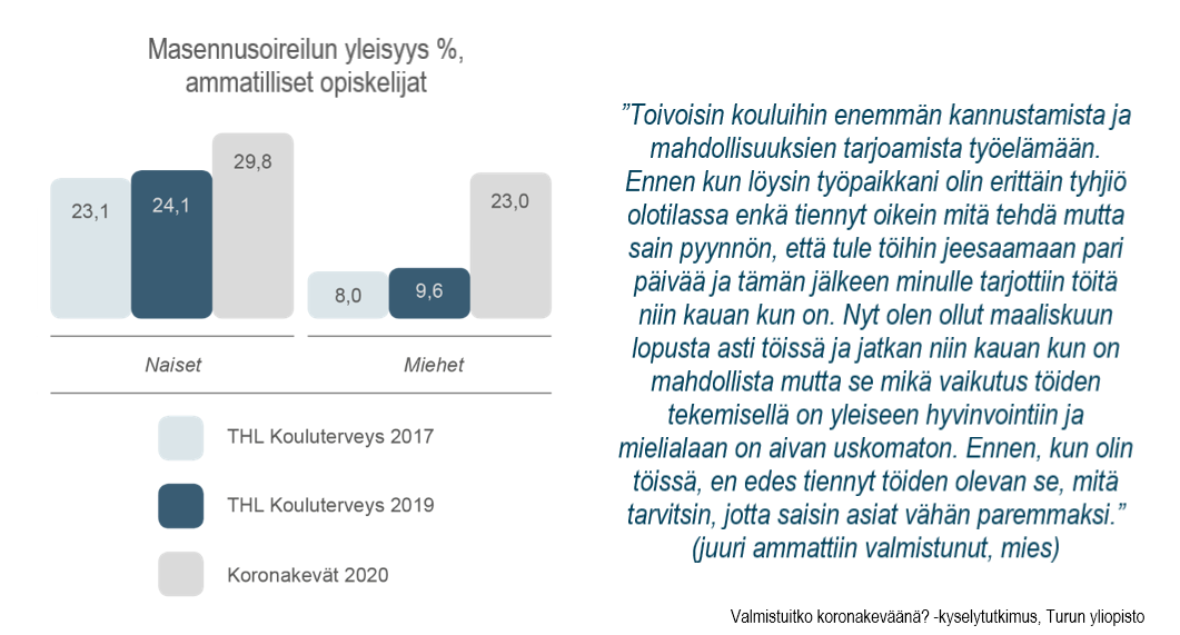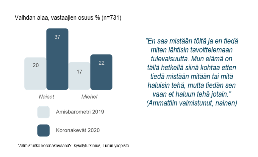 Tutkimustulosten mukaan koronakriisi iskee erityisesti juuri ammattiin valmistuviin nuoriin. Nuorisotyöttömyys on kasvanut yli kaksi kertaa muuta työttömyyttä nopeammin kriisin aikana. Joka kolmas (34%) ammattiin valmistuvista ei uskonut työllistyvänsä alalleen lainkaan. Nuorten ahdistuneisuus ja masennusoireet ovat yleistyneet, ja moni on jäänyt ilman tarvitsemaansa palvelua tai apua mielialaan liittyen.