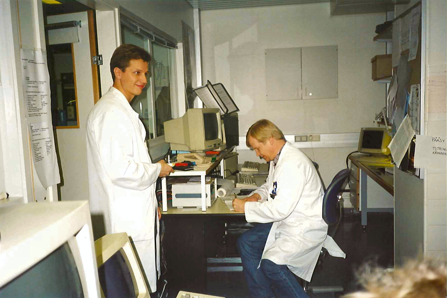 Nuori tutkija Juhani Knuuti and radiokemisti Hannu Sipilä valvomassa PET-tutkimusta 90-luvun alussa.