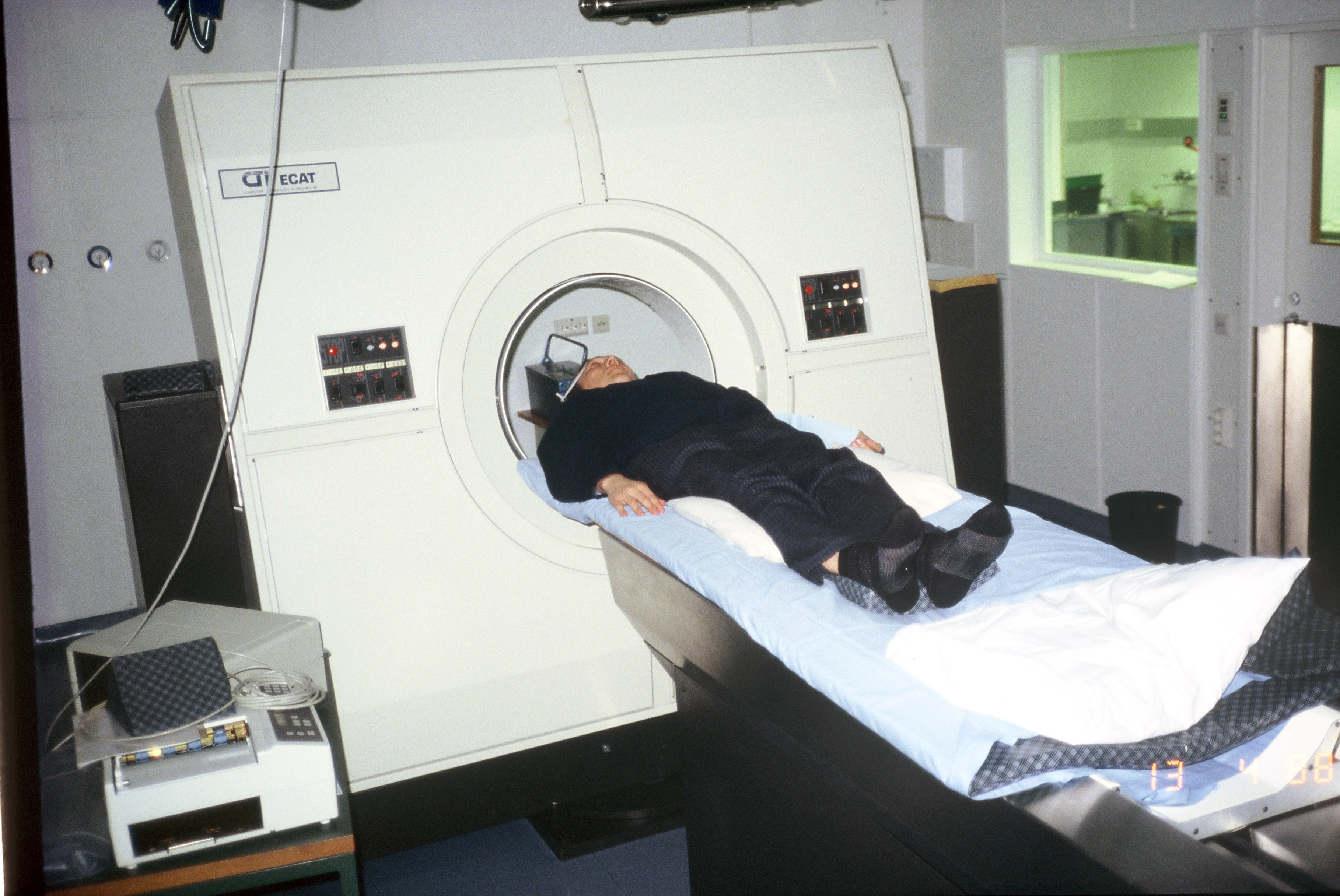 Ensimmäisellä PET-kameralla tehty ensimmäinen oikea PET-tutkimus vuodelta 1988. Kuvattavana ylifyysikko Jyrki Kuikka.