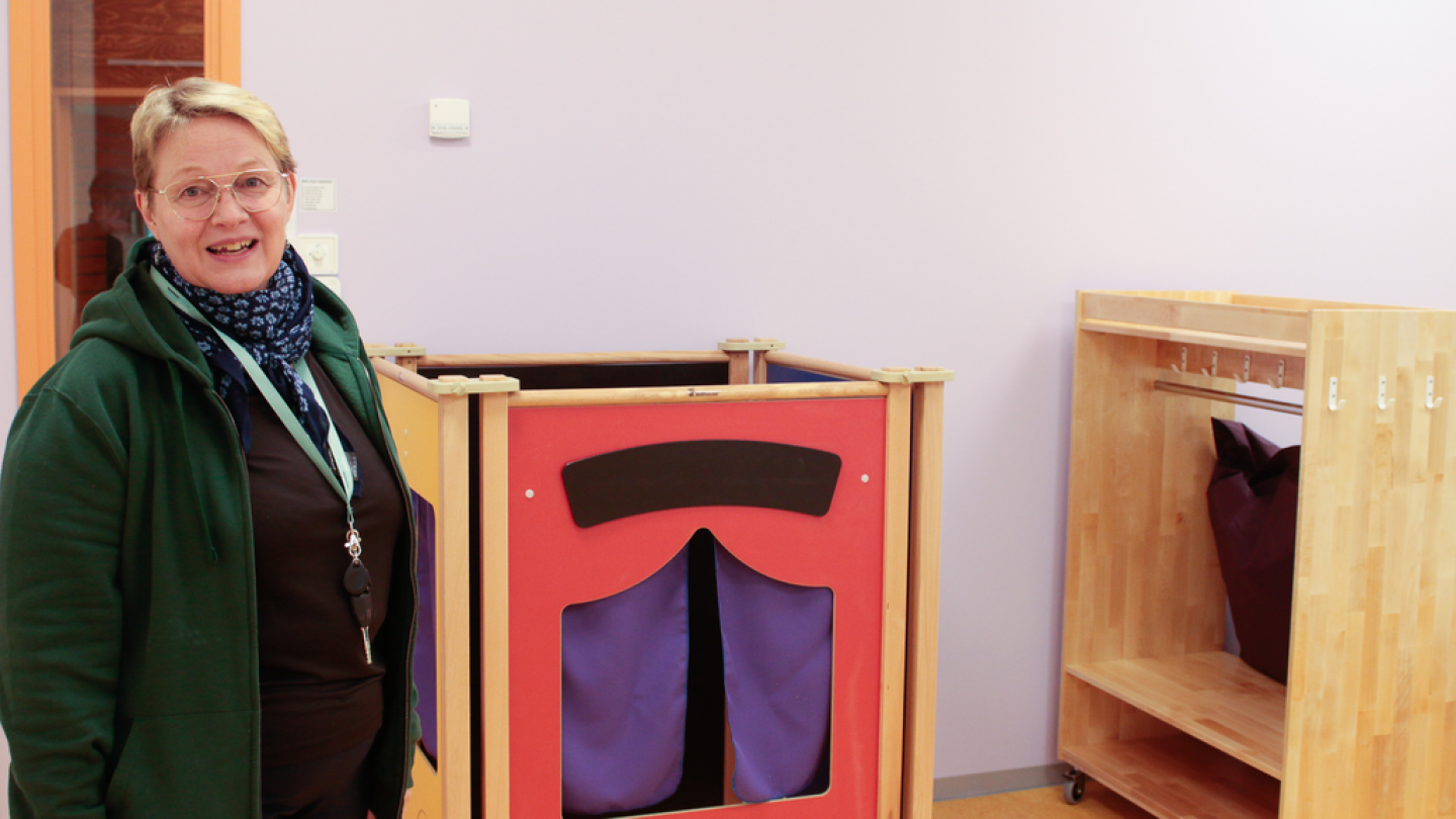 Päiväkotiin on luotu myös teknisiä keinoja, joilla voi monipuolistaa varhaiskasvatuksen koulutusta. Anne Toivonen esittelee huonetta, josta on rakennettu videoyhteys opettajankoulutuslaitokselle. Yhteys voi olla vuorovaikutusken mahdollistava reaaliaikainen tai tilannetta voidaan seurata myös tallenteena.