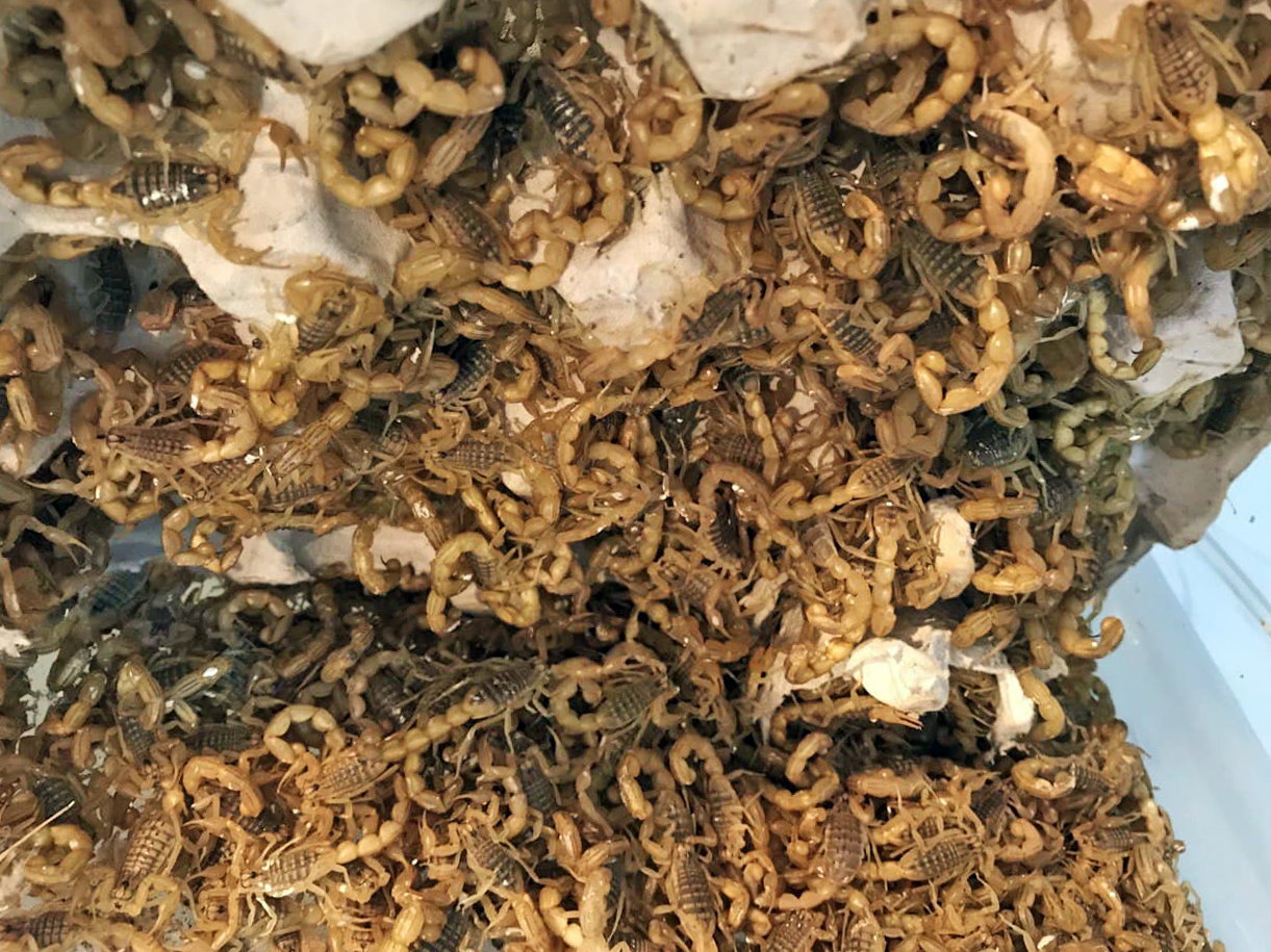 Skorpioneja on helppo kerätä yöaikaan. Lajit loistavat UV-lampun valossa, joten yksi kerääjä saattaa löytää yhden yön aikana jopa tuhansia skorpioniyksilöitä. Kuvassa satoja Mesobuthus eupeus-skorpioneja laittoman skorpionifarmin altaissa Iranissa. Kuva: Alireza Shahrdari