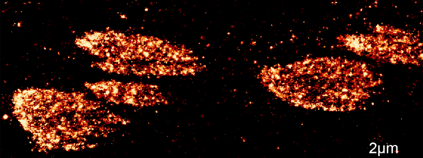 Pääkuvassa yksittäisiä adheesiorakenteita, joista leimattu vinkuliiniproteiini.
